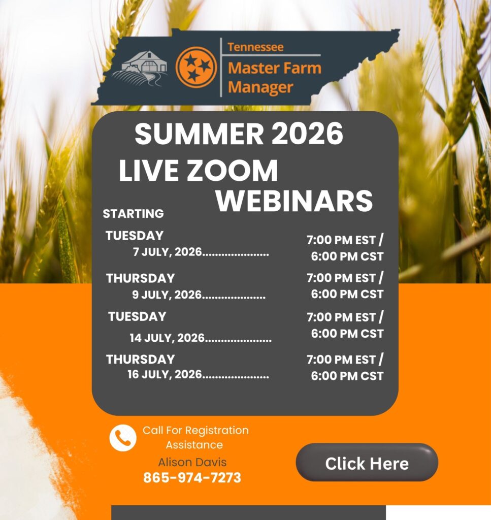 Tennessee Master Farm Manager will focus on solid business principles and efficiently utilizing resources on the farm. The Winter Master Farm Manager Course will utilize a hybrid method, with both prerecorded videos and live webinars. Zoom based webinar sessions will be held on Tuesday and Thursday nights for two weeks starting Tuesday, July 7, 2026, at 7PM EST/6PM CST. Registered participants will be emailed a Zoom link and instructions the day before each session.